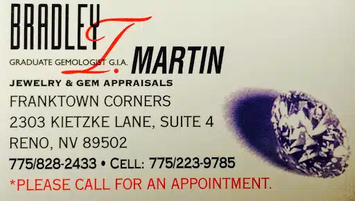 Bradley T. Martin Graduate Gemologist and Jewelry Appraiser (G.I.A.) is a hidden gem of a jewelry store located in Reno, Nevada. As a jewelry appraiser, Bradley T. Martin offers a unique service that sets this store apart from others in the area. With years of experience in the industry, Bradley T. Martin has earned the prestigious Graduate Gemologist certification from the Gemological Institute of America (G.I.A.). This means that customers can trust his expertise when it comes to valuing and appraising their precious jewelry.
