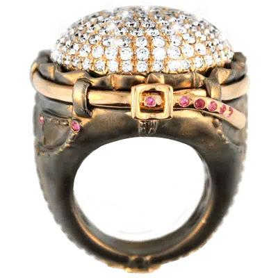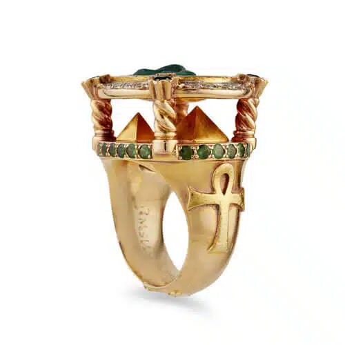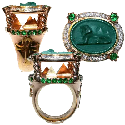 One of Erin's most impressive designs is The First Vision, a two-level ring with a coffin on the bottom level and a sculpture of the Last Knight, sword and all. The famous Rose Window, made of black diamonds, blue sapphires, and red rubies, became the window's stained glass. The supports between the levels are four Gothic flying buttresses. The ring was engraved to match the gargoyle faces on the two side arches.